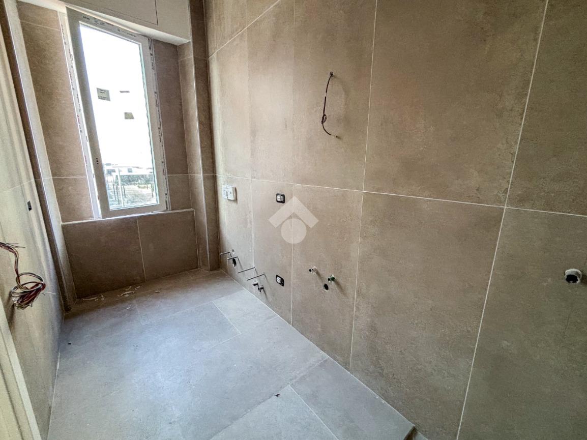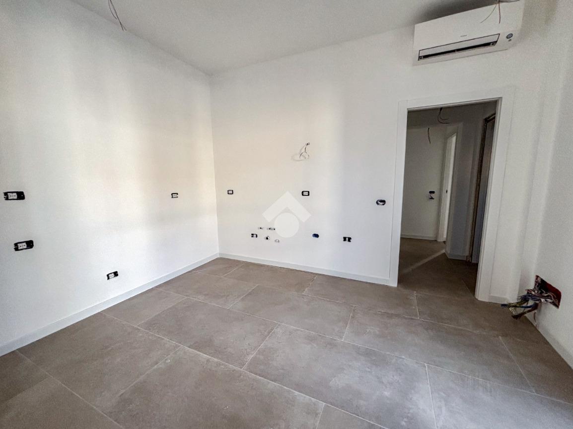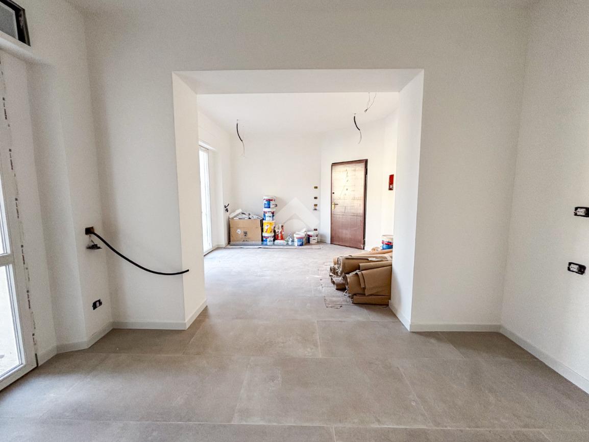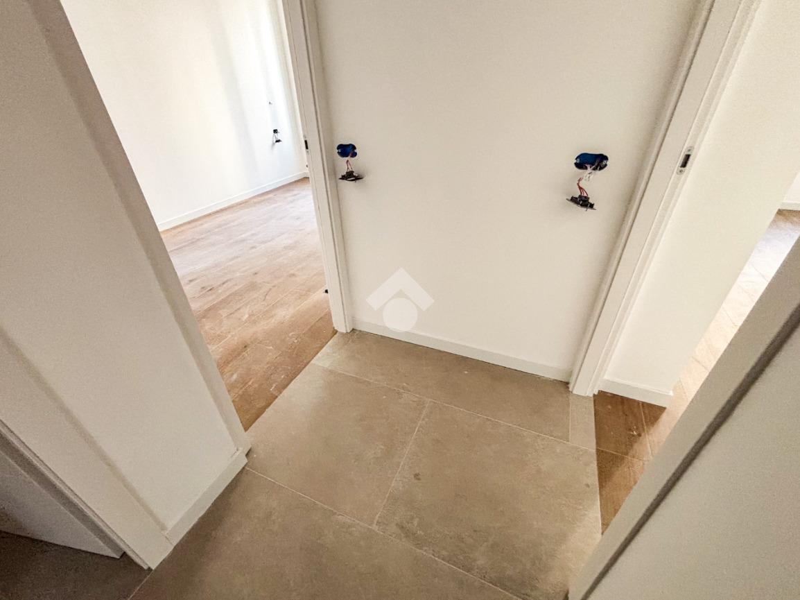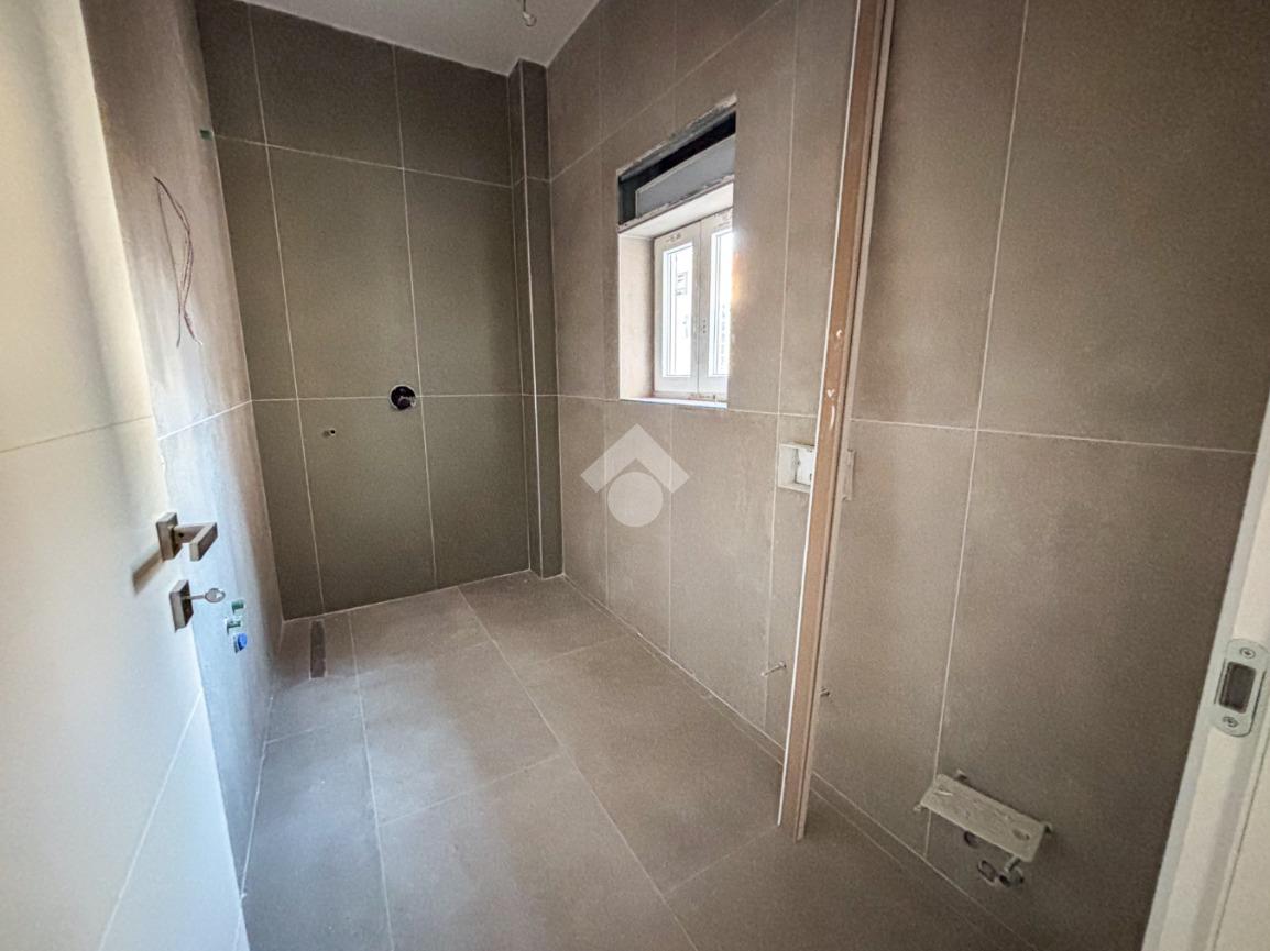 Entrando nell’appartamento si viene accolti direttamente dalla zona giorno con cucina a vista, un ambiente moderno e luminoso che, grazie alla porta finestra, conduce al balcone angolare, ideale per momenti di relax all’aperto. Proseguendo, sulla sinistra, troviamo un comodo ripostiglio e una prima camera da letto dotata di bagno en suite finestrato con doccia; sulla destra si sviluppano il secondo bagno, anch’esso finestrato e con doccia, e la seconda camera da letto.